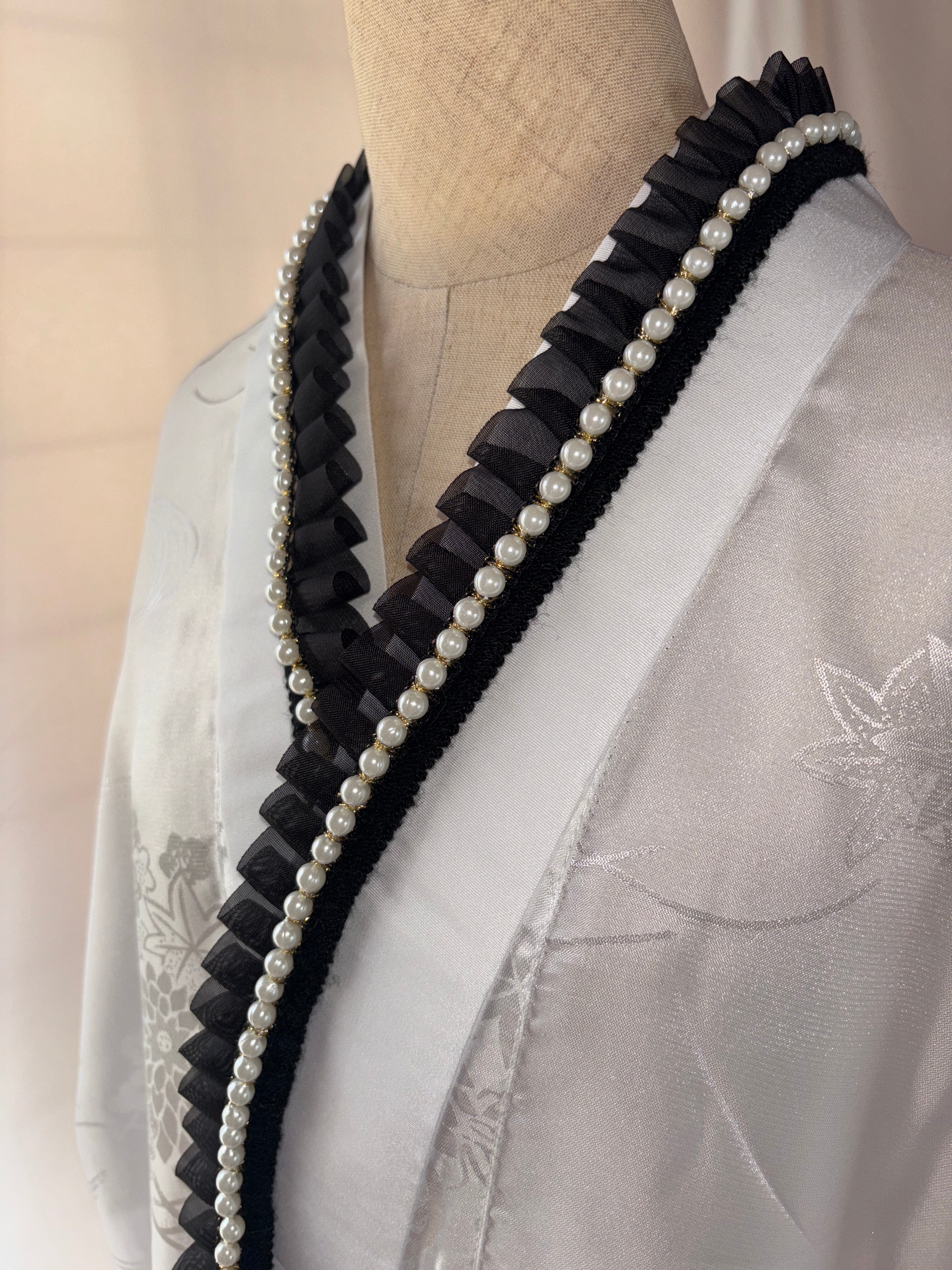 イミテーションパールとフリルが特徴の半衿素材です。